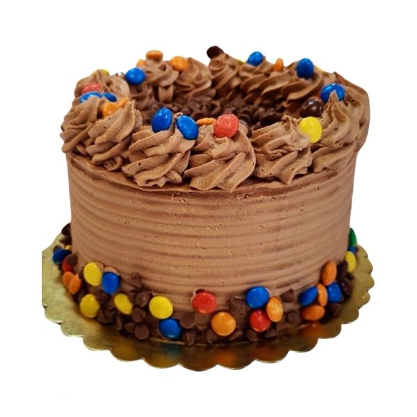 Three layers of chocolate sponge, filled with chocolate ganache and chocolate mousse, topped with chocolate frosting and decorated with chocolate M & M’s.
