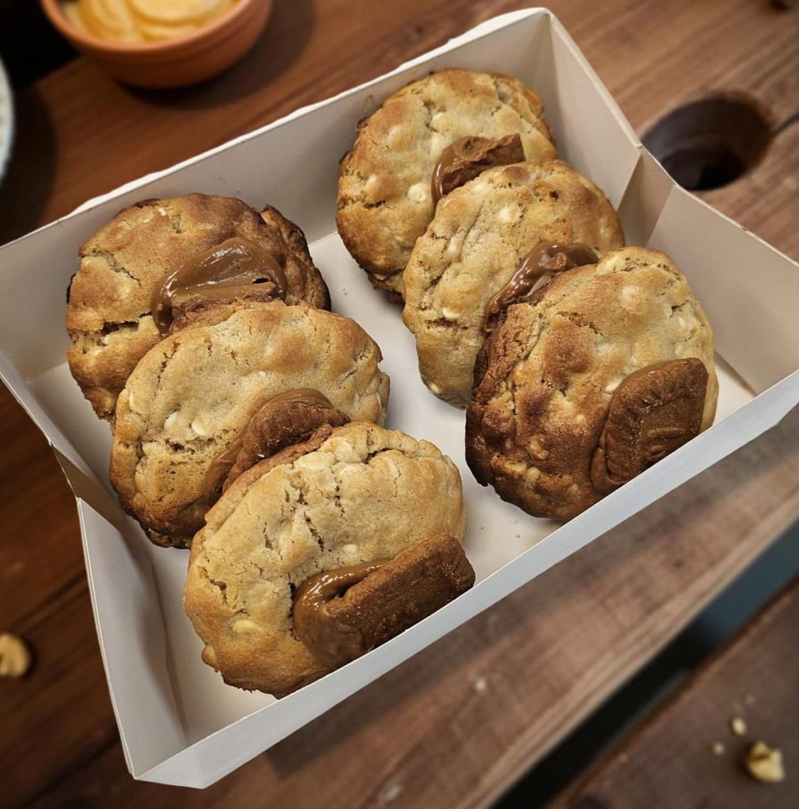 Extra large Lotus and white chocolate chip cookies with a Lotus Biscoff creme filling- Available to buy in packs of 6 or 12