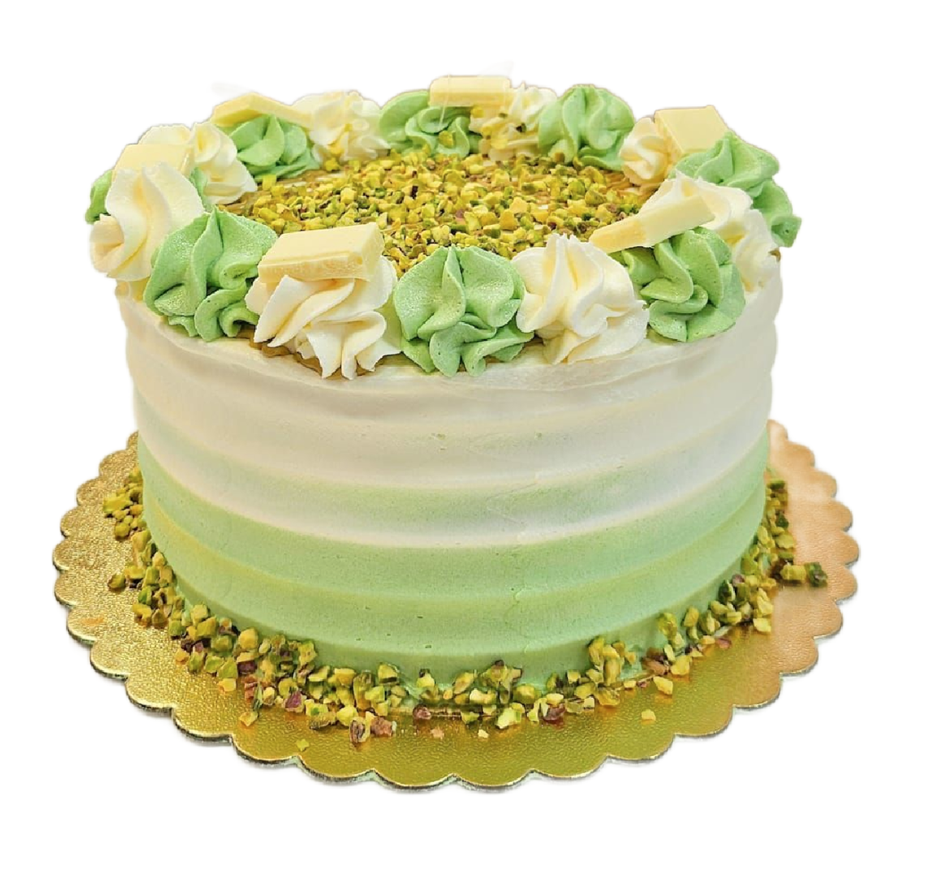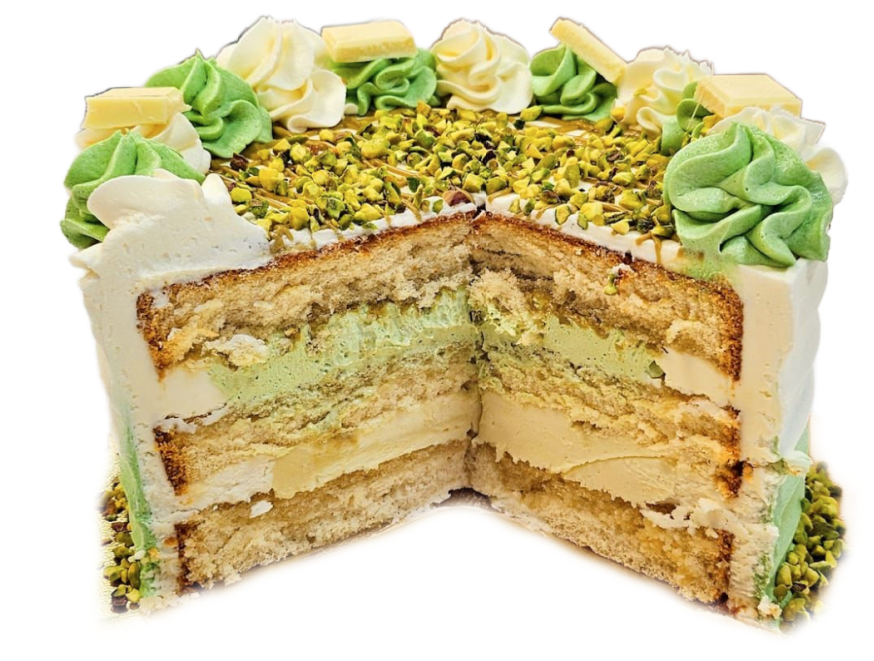 Three layers of vanilla sponge, filled with one layer of white chocolate ganache and one layer of pistachio mousse with a crunchy pistachio cream, topped with pistachio and white chocolate frosting and pistachio pieces.